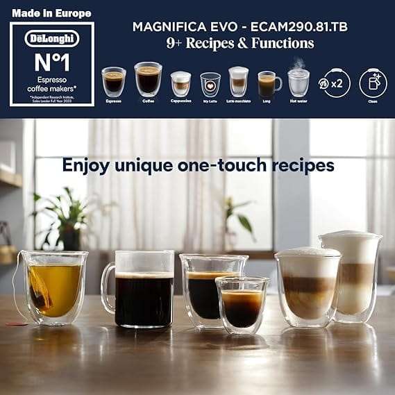 Enjoy the perfect coffee experience with the De’Longhi Magnifica Evo—where advanced techNology meets everyday convenience. With its sleek, black body and chrome detailing, it adds style to your home coffee bar while delivering barista-quality beverages at the touch of a button. Equipped with the MyLatte function for zero-waste milk usage, LatteCrema Hot TechNology for velvety foam, and 7 one-touch recipes, this machine simplifies specialty coffee preparation. Its soft touch control panel, intuitive icons, and bean-to-cup freshness make it ideal for coffee lovers who value quality, efficiency, and design in one beautiful package.